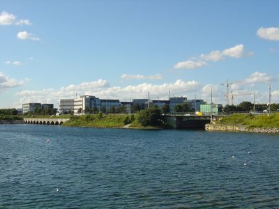 El Seelandbrug se extiende sobre el agua con dos carriles de tráfico en cada dirección, conectando diferentes zonas del área urbana de Copenhague.