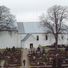 La iglesia de piedra caliza se encuentra entre dos montículos funerarios, con muros de piedra, campanario y elementos arquitectónicos nórdicos del siglo XII.