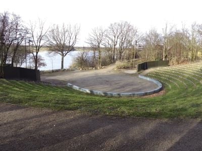 El teatro exterior presenta espectáculos con un entorno natural de árboles y un lago, formando un escenario para producciones vikingas.