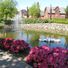 El estanque central presenta un puente de madera y contiene un barco de guerra en miniatura llamado Labri, rodeado de zonas verdes.