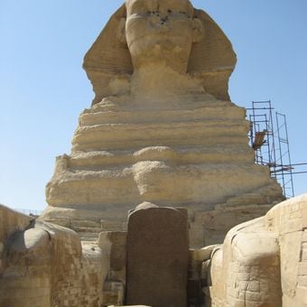 Una estela rectangular de granito rosa de 3.6 metros de altura se encuentra entre las patas delanteras de la Gran Esfinge de Giza.