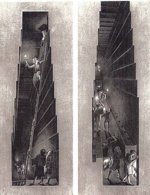 El corredor descendente se extiende 105 metros hacia la roca base, mientras la Gran Galería asciende en un ángulo de 26 grados por 47 metros.