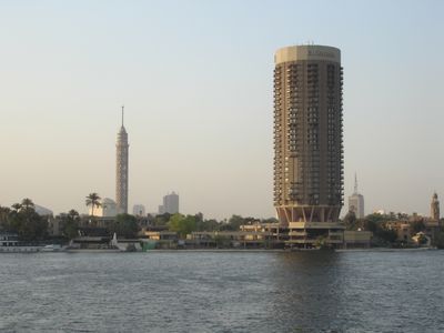 El Hotel El Gezira Sheraton se eleva 100 metros sobre el río Nilo, con 27 pisos que incluyen balcones orientados hacia el agua y el paisaje urbano.