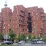 El edificio de catorce plantas contiene 446 apartamentos distribuidos alrededor de cinco patios interiores, con una estructura modular y paredes exteriores rojas y azules.