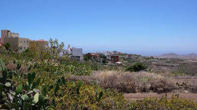 El pueblo se extiende por suaves pendientes con campos cultivados de tomates y papas junto a casas tradicionales canarias de piedra y calles estrechas.