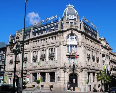El edificio Banco Pastor presenta fachadas de cantería granítica con un chaflán destacado coronado por una cúpula que marca el acceso principal.