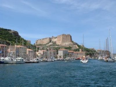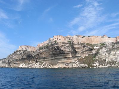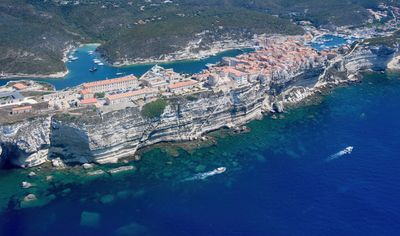 Bonifacio es una ciudad fortificada situada sobre una meseta de piedra caliza que se eleva 70 metros sobre el Mediterráneo en el extremo sur de Córcega. Las casas se apiñan junto al borde de los acantilados blancos, mientras abajo un puerto natural protegido se adentra entre paredes rocosas verticales.