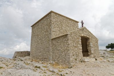 La Capilla de Saint-Pilon se eleva a 994 metros sobre la gruta de Sainte-Baume, construida en piedra con una única abertura en el techo.