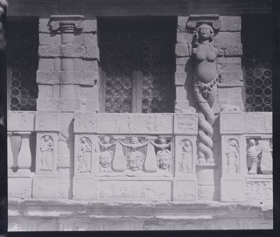 El friso decorativo del edificio contiene metopas y triglifos, junto con esculturas de cabezas de animales y bucráneos, representando elementos arquitectónicos clásicos.