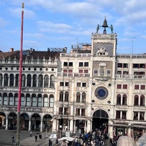La Torre del Reloj de San Marcos es una estructura renacentista en la Piazza San Marco que se alza sobre los edificios circundantes con su arquitectura característica. El edificio presenta un gran arco de entrada que conduce a la calle Merceria y muestra una esfera astronómica que indica horas y minutos con un fondo zodiacal.