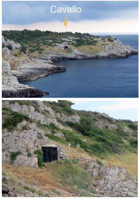 Grotta del Cavallo es una cueva de piedra caliza en Nardò con una entrada redondeada que se abre hacia la costa mediterránea. El sitio contiene múltiples capas de depósitos que registran diferentes períodos cuando los humanos vivían y utilizaban el abrigo.