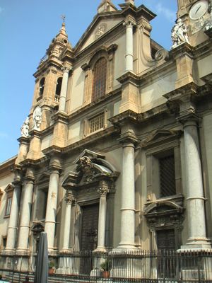 La iglesia presenta torres campanario gemelas en su fachada, con múltiples columnas y estatuas que representan varios santos incluyendo Santa Rosalía y San Felipe Neri.