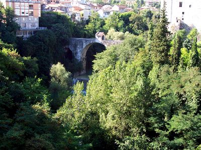 El Ponte di Cecco cruza el río Castellano con dos arcos asimétricos y está construido con grandes bloques de travertino de 43 metros de longitud.