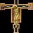 El crucifijo incorpora inscripciones en latín, griego y hebreo en la parte superior, mientras que los paneles laterales muestran a María y San Juan.