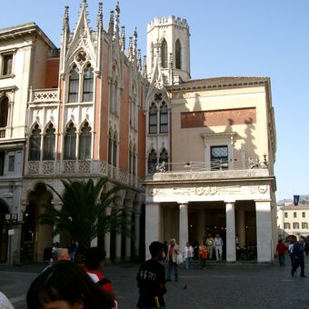 El Café Pedrocchi presenta una arquitectura neoclásica con arcadas dóricas y cuatro leones de piedra que custodian su entrada en la Plaza Cavour.