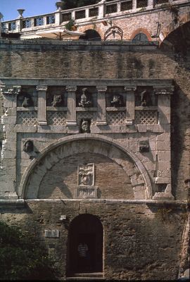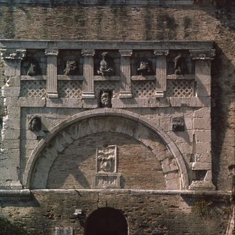La puerta muestra cinco esculturas separadas por pilastras estriadas, incluyendo una figura masculina central que representa a Tinia, junto a figuras de deidades antiguas.