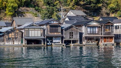 Una fila de 230 casas barco funaya se extiende a lo largo de 5 kilómetros de costa, con almacenamiento para embarcaciones en planta baja y viviendas arriba.