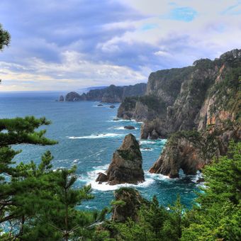 Kitayamazaki es una formación de acantilados en la prefectura de Iwate que se extiende a lo largo del océano Pacífico. Los acantilados se alzan abruptamente desde el agua y muestran capas de roca de diferentes tipos.