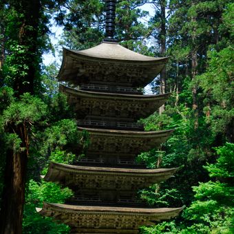 La pagoda de madera de 29 metros presenta cinco niveles cubiertos con tejas de cedro y se encuentra en un bosque al pie del Monte Haguro.