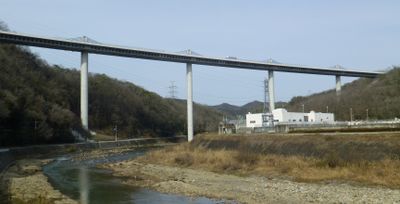El Puente Shin-Meishin Mukogawa se extiende 442.2 metros sobre el río Mukogawa, con una estructura de alma en mariposa y sistema de cables extradosados.