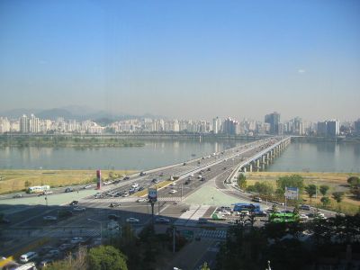 El Puente Mapo es un puente de carretera en el distrito de Mapo en Seúl, Corea del Sur, que cruza el río Han con múltiples carriles de tráfico y senderos separados para peatones y ciclistas. Su construcción de acero y hormigón descansa sobre pilares masivos que se elevan desde el agua, formando una serie de arcos entre las orillas del río.
