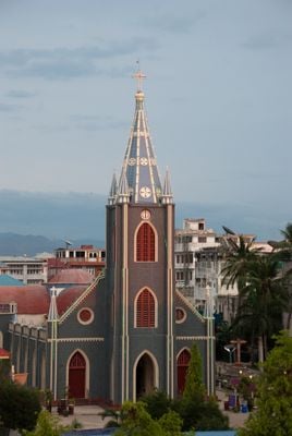 La Catedral del Sagrado Corazón es un templo católico romano con una fachada distintiva de color azul y blanco, ubicado entre la calle 25 y 26 en la carrera 81 de Mandalay. El edificio presenta dos torres y cuenta con un espacio principal de culto junto a una capilla anexa que sirve funciones religiosas adicionales.