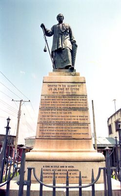 El monumento, erigido en 1903 mediante suscripción pública, conmemora al Rey Jaja, quien estableció rutas comerciales y mantuvo la paz entre las comunidades costeras.