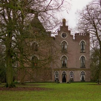 El castillo se originó alrededor de 1300 por Hinder van Wulven, con modificaciones posteriores que incluyen alas añadidas en 1847 y 1864.