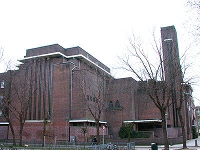 La Sinagoga Raw Aron Schuster presenta elementos arquitectónicos de la Escuela de Amsterdam con una estructura en bloques, torre y pronunciados aleros en Jacob Obrechtplein.