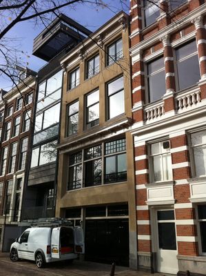 Pand met gepleisterde gevel onder rechte lijst met consoles, building in Amsterdam, Netherlands