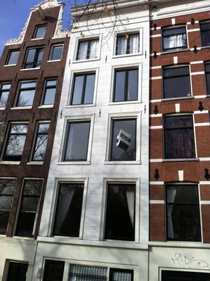 Pand met gepleisterde gevel onder rechte lijst, met vensteromlijstingen, building in Amsterdam, Netherlands