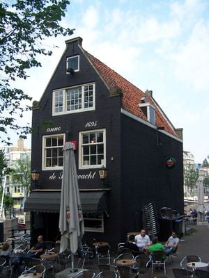 El Goslerhuisje se mantiene como una construcción estrecha con tejado de gablete, bandas de piedra y volutas en el puente Sint Antoniesluis.