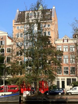 Pakhuis met ingezwenkte halsgevel met volutenafdekking waarop vaas