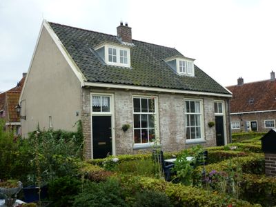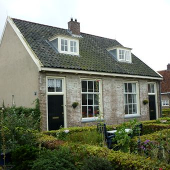 Huis met lijstgevel. Zijgevel gepleisterd en gewit