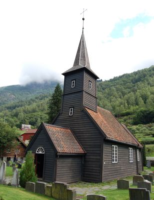 Flåm Church, Iglesia patrimonial en el valle de Flåmsdalen, Noruega.