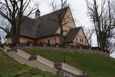 La construcción de la iglesia incorpora madera de larix en toda su estructura, demostrando métodos tradicionales de carpintería polaca en arquitectura religiosa.