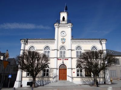 El ayuntamiento, terminado en 1845, surgió de un diseño del arquitecto italiano Henryk Marconi, con aportaciones del constructor local Józef Iżycki.