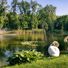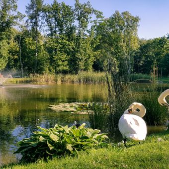 El parque de 20 hectáreas presenta un estanque central con fuente, numerosos senderos y diversas especies de árboles como abedules, alisos y sauces.