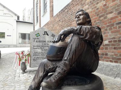 La estatua de bronce a tamaño natural representa al campeón de Fórmula 1 Ayrton Senna sentado sobre un neumático de coche de carreras.