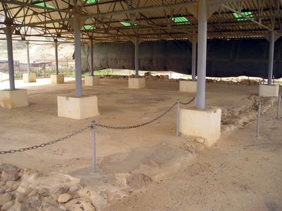 La sinagoga conserva suelos con patrones geométricos y diseños zodiacales parcialmente borrados que cubren un espacio religioso cerca de Ein ad-Duk.