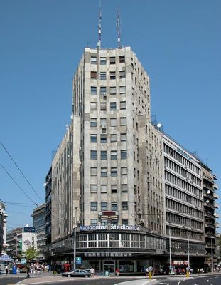 El edificio representa la arquitectura modernista serbia con su fachada sin ornamentos, revestimiento de mármol gris-azul y diseño de base libre.