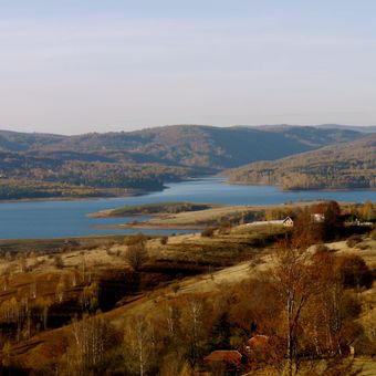 El lago Vlasina abarca 16 kilómetros cuadrados a una altitud de 1213 metros, siendo el embalse artificial más alto y grande de Serbia.