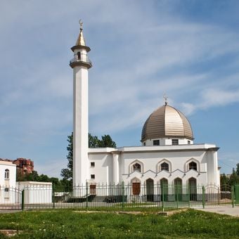 La Mezquita Memorial de Leningrado presenta un alto minarete, una gran cúpula central y patrones geométricos que adornan sus paredes exteriores blancas.