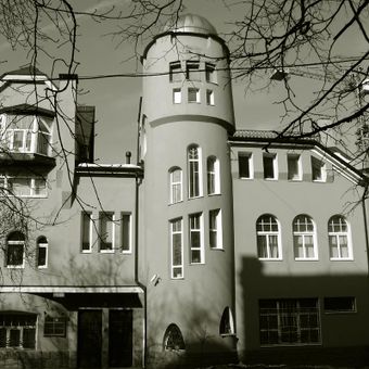 La Casa de la Sociedad 'Trabajo Infantil y Recreación' se encuentra en el Callejón Vadkovsky, exhibiendo elementos arquitectónicos de principios del siglo XX.