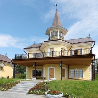 El Museo de la Hacienda Demidov consta de tres edificios de piedra de estilo Imperio, con una torre con aguja y elementos decorativos en el techo.