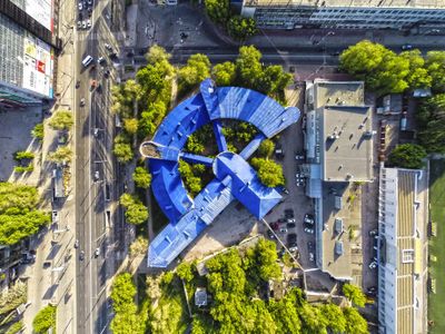 El edificio de dos plantas presenta un diseño complejo en forma de martillo y hoz cuando se observa desde arriba.