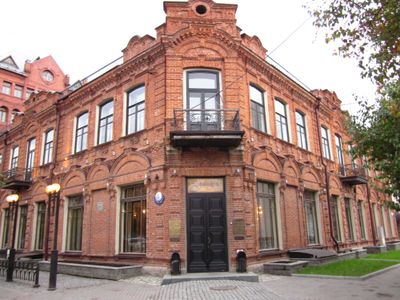 Situada en la intersección de las calles Sovetskaya y Gorky, el edificio funciona actualmente como tienda de vinos y restaurante.