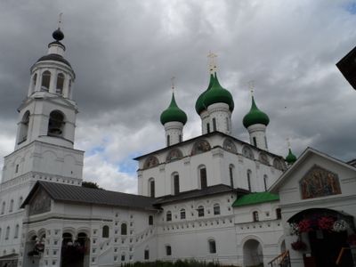 El Tolga Katholikon es una iglesia ortodoxa oriental ubicada en el centro del complejo monástico en la ribera del río Volga con cinco cúpulas doradas. La estructura domina el asentamiento ribereño y controla todo el panorama visual del complejo monástico por su forma monumental.