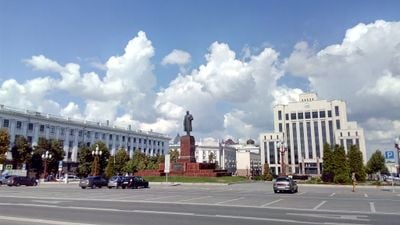El monumento a Lenin se encuentra en la Plaza de la Libertad, representando al líder soviético en posición dominante con el brazo derecho extendido.