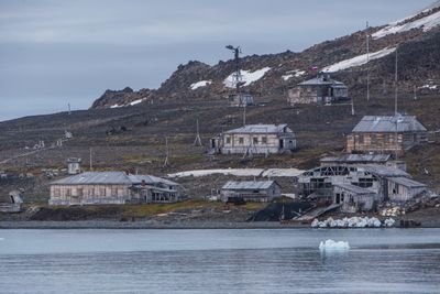 Buhta Tihaja es una instalación de investigación con varios edificios ubicados a lo largo de la costa norte de la isla Hooker en el archipiélago de Tierra de Francisco José. Las estructuras se distribuyen por el área costera y muestran cómo se organizaban las estaciones polares durante la exploración ártica temprana.
